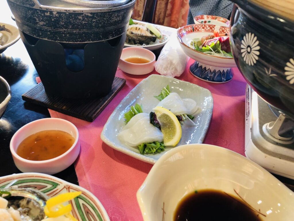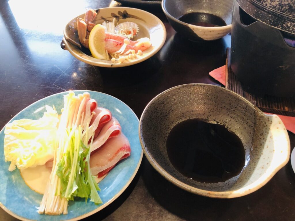 黒毛和牛の陶板焼き、アワビのお造り、カニのしゃぶしゃぶといった、他のお宿ではそれだけでメイン級を張れる品の数々をいただきました。